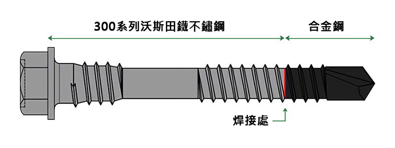 複合螺絲由位於螺絲上半部的300系列沃斯田鐵不鏽鋼以及下半部的合金鋼所組成。